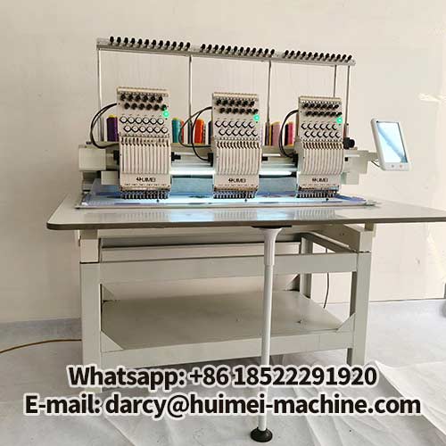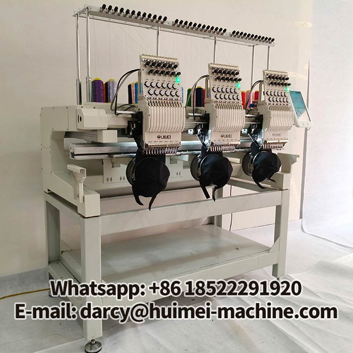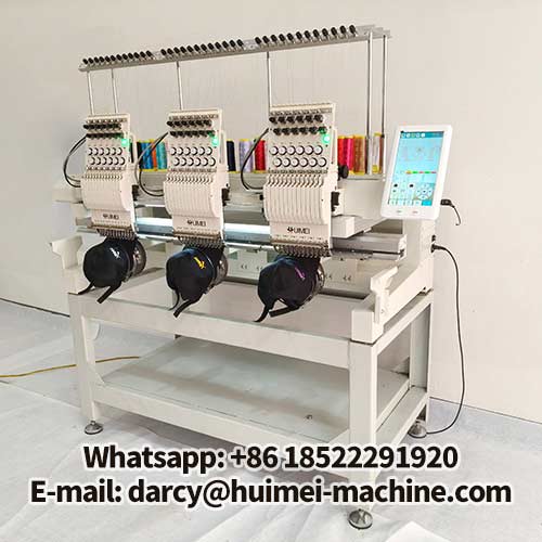 This is a demonstration of the hat embroidery function on the Huimei embroidery machine. In this mode, you can make three hats simultaneously. Operation is very simple; the machine is already in hat embroidery mode when you receive it. Simply turn it on and clip the hats onto the hat frame to begin.